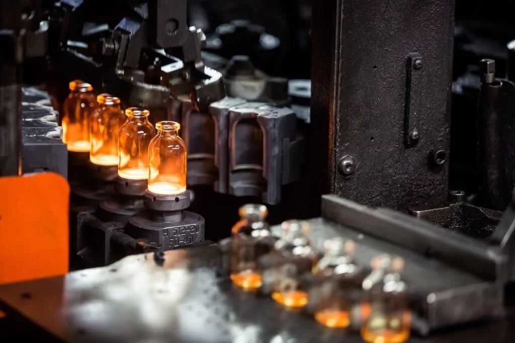 Process glass bottle hot coating is carried out after bottle forming and before annealing treatment. When the process glass bottle is slowly cooled to 500 ~ 600℃, the metal coating agent is sprayed on the surface of the container to form a protective film of a certain thickness, which enhances the surface strength of about 30%, and can make the bottle withstand long-term water washing and washing.